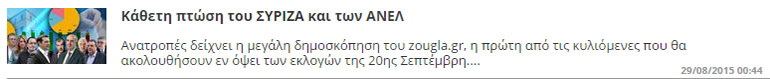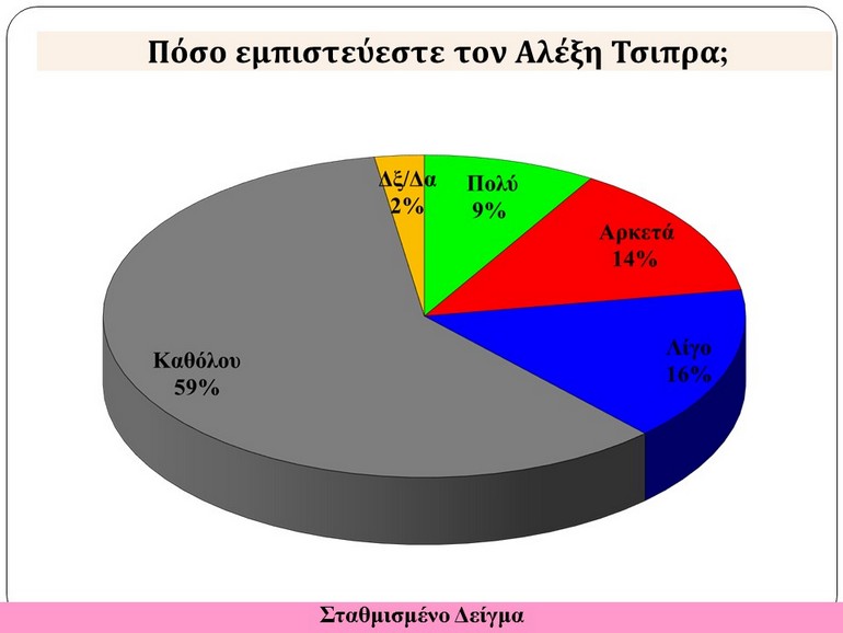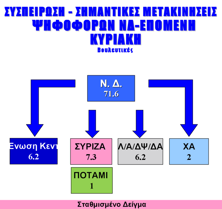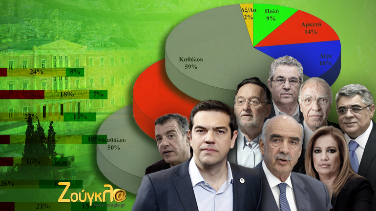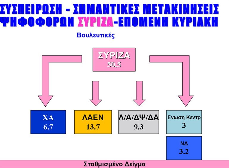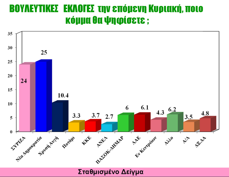 Πιο συγκεκριμένα, ο ΣΥΡΙΖΑ κινείται στο 24%, ενώ οι ΑΝΕΛ συγκεντρώνουν 2,7% και βρίσκονται οριακά εκτός Βουλής. Η Λαϊκή Ενότητα του Παναγιώτη Λαφαζάνη αποσπά 6,1%, ενώ και η Χρυσή Αυγή διατηρεί υψηλά ποσοστά. Το ΠΑΣΟΚ-ΔΗΜΑΡ παίρνει 6 μονάδες, το ΚΚΕ 3,7%, το ΠΟΤΑΜΙ 3,3%, ενώ είσοδο στη Βουλή (οκτακομματική) εξασφαλίζει η Ένωση Κεντρώων του Βασίλη Λεβέντη, με 4,3%.