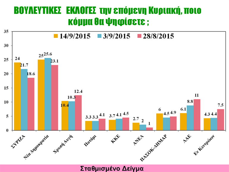 Τα δύο μεγάλα κόμματα σταθεροποιούν τις δυνάμεις τους με τη ΝΔ να παγιώνει ένα οριακό προβάδισμα έναντι του κόμματος του Αλέξη Τσίπρα, με τον ΣΥΡΙΖΑ να παίζει το τελευταίο του χαρτί ώστε να συσπειρώσει τους ψηφοφόρους του, λόγω της «αιμορραγίας» προς τη Λαϊκή Ενότητα του Παναγιώτη Λαφαζάνη.