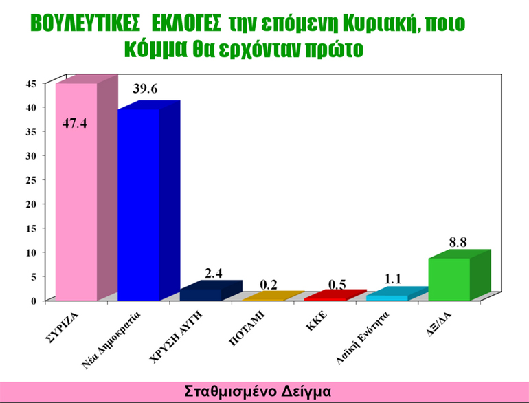 Στην παράσταση νίκης ο ΣΥΡΙΖΑ θα ερχόταν πρώτος με διαφορά από τη Νέα Δημοκρατία, με το ποσοστό των αναποφάσιστων να ανέρχεται στο 8,8%.