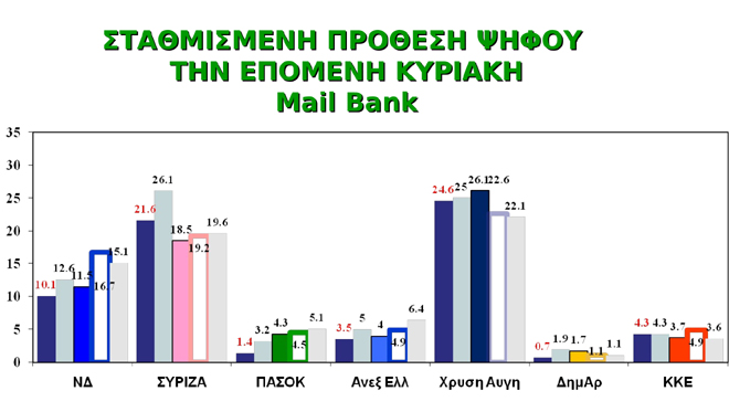 Ο ΣΥΡΙΖΑ διατηρεί μεγάλο προβάδισμα και στο ερώτημα της παράστασης νίκης για τις βουλευτικές εκλογές συγκεντρώνοντας 59,4%, ενώ δεύτερο κόμμα έρχεται η Νέα Δημοκρατία με 18,9%. Στην πρόθεση ψήφου, όμως, η Χρυσή Αυγή αναδεικνύεται πρώτο κόμμα με ποσοστό 24,6%, ακολουθεί με τρεις μονάδες διαφορά ο ΣΥΡΙΖΑ (21,6%), τρίτο κόμμα είναι το «Ποτάμι» με 11% και έπεται η ΝΔ με ποσοστό 10,1%. Το ΕΠΑΜ αυξάνει εντυπωσιακά τα ποσοστά του και αποσπά 4,8%, το ΚΚΕ συγκεντρώνει 4,3%, ακολουθούν οι ΑΝ.ΕΛ. με 3,5%, ενώ ΠΑΣΟΚ και ΔΗΜΑΡ καταποντίζονται με 1,4% και 0,7 αντίστοιχα.