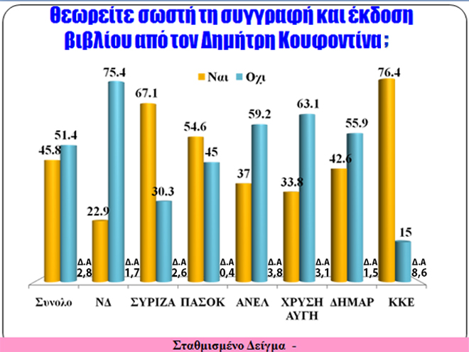 Εξαιρετικό ενδιαφέρον παρουσιάζει το γεγονός ότι υπέρ της έκδοσης του βιβλίου τάχθηκαν σε ποσοστό 76,4% οι ψηφοφόροι του ΚΚΕ, του ΣΥΡΙΖΑ (67,1%) και του ΠΑΣΟΚ (54,6%), ενώ αρνητική γνώμη έχουν οι ψηφοφόροι της Νέας Δημοκρατίας, της Χρυσής Αυγής και των ΑΝ.ΕΛ.