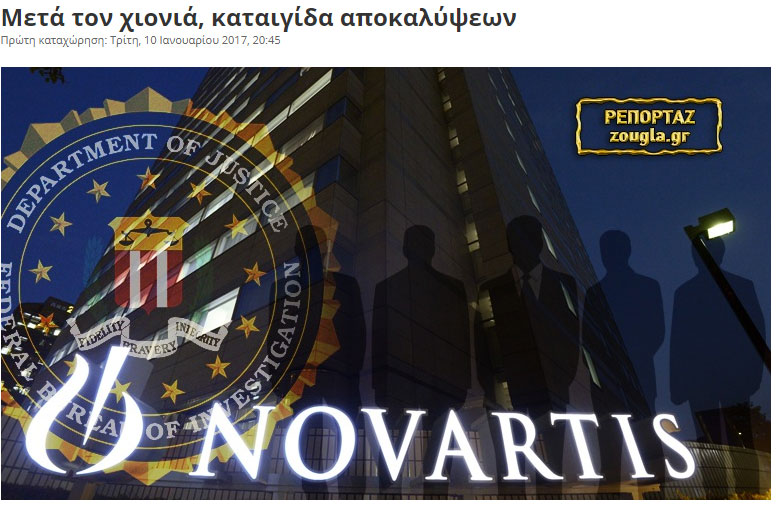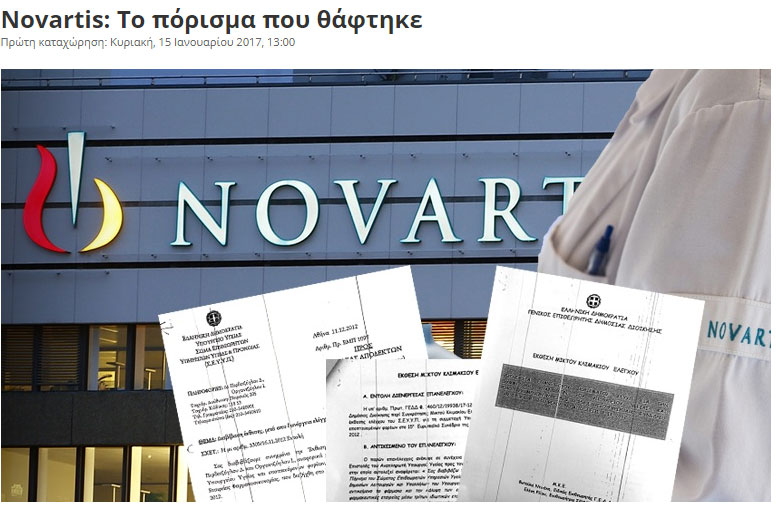 Toν Ιανουάριο του 2017 εισαγγελείς διαφθοράς εισέβαλαν στα γραφεία της εταιρείας και κατάσχεσαν έγγραφα και ηλεκτρονικούς υπολογιστές, διαπιστώνοντας πως η Novartis είχε στήσει έναν πολύπλοκο μηχανισμό. Σε αυτόν συμμετείχαν γιατροί, διοικήσεις νοσοκομείων, εκδότες και δημοσιογράφοι. Οι στόχοι του μηχανισμού ήταν δύο: οι συνταγογραφήσεις των φαρμάκων της Novartis, καθώς και οι αυξήσεις τιμών ορισμένων σκευασμάτων, που πρωτοκυκλοφορούσαν στην Ελλάδα και αποτελούσαν κριτήριο για τη διαμόρφωση τιμών και σε άλλες ευρωπαϊκές χώρες.