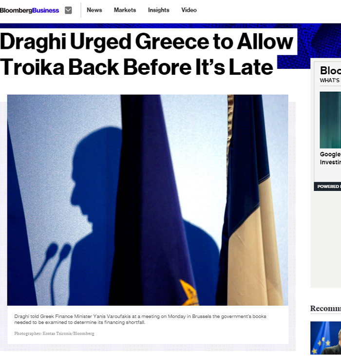 Ιδιαίτερο ενδιαφέρον παρουσιάζει δημοσίευμα του Blοomberg για το «παρασκήνιο» του Eurogroup και τη συζήτηση του προέδρου της Ευρωπαϊκής Κεντρικής Τράπεζας Μάριο Ντράγκι με τον Έλληνα ΥΠΟΙΚ Γιάνη Βαρουφάκη, προκειμένου ο δεύτερος να αποδεχθεί την έλευση των τεχνικών κλιμακίων στην Ελλάδα.