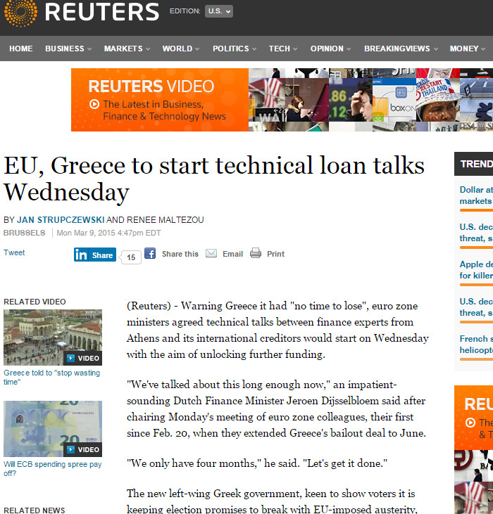 Σε εκτενές δημοσίευμα, το Reuters τονίζει ότι οι Ευρωπαίοι εταίροι επιθυμούν από την Ελλάδα να σταματήσει να σπαταλά χρόνο και να ξεκινήσουν άμεσα οι τεχνικές συζητήσεις επί των μεταρρυθμίσεων.