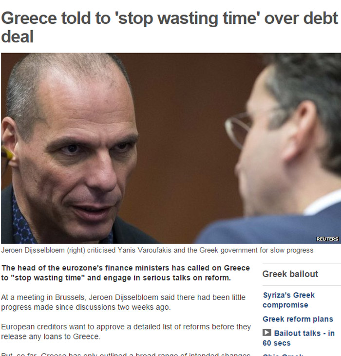Το βρετανικό BBC μεταδίδει ότι ο επικεφαλής του Eurogroup Γερούν Ντάισελμπλουμ κάλεσε την Ελλάδα «να σταματήσει να σπαταλά χρόνο και να δεσμευθεί σε σοβαρές συζητήσεις για μεταρρυθμίσεις».