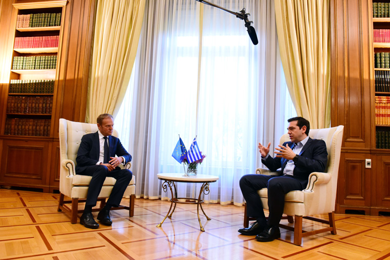 Σε καλό κλίμα, αλλά στη σκιά του χθεσινού «ναυαγίου» των διαπραγματεύσεων στις Βρυξέλλες, πραγματοποιήθηκε στο Μέγαρο Μαξίμου η συνάντηση του Αλέξη Τσίπρα με τον πρόεδρο του Ευρωπαϊκού Συμβουλίου Ντόναλντ Τουσκ.