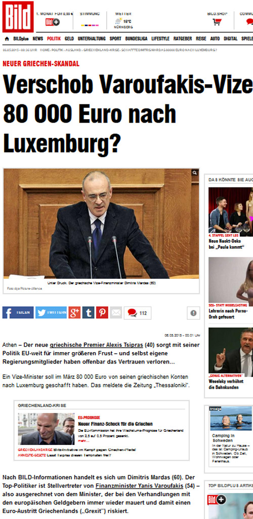 «Ο νέος Έλληνας πρωθυπουργός, Αλέξης Τσίπρας, απογοητεύει όλο και περισσότερο με την πολιτική του, ενώ μέλη της κυβέρνησής του φαίνεται να χάνουν την αξιοπιστία τους…Ένας αναπληρωτής υπουργός φέρεται να μετέφερε από ελληνικό λογαριασμό στο Λουξεμβούργο 80.000 ευρώ, όπως αναφέρει η εφημεριδα “Θεσσαλονίκη”» αναφέρει η Bild και συνεχίζει: «Σύμφωνα με πληροφορίες ο εν λόγω υπουργός είναι ο Δημήτρης Μάρδας».