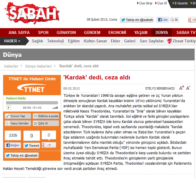 Η εφημερίδα «Sabah» φέρει τίτλο στο σχετικό της άρθρο «Είπε Kardak και τιμωρήθηκε».