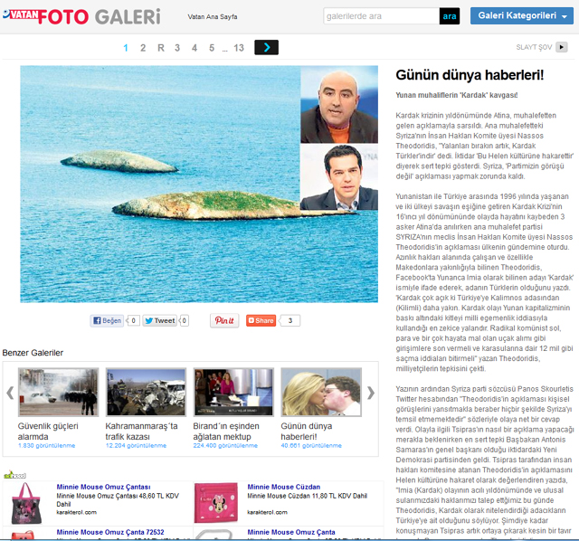 Η «Vatan» φέρει τίτλο στο άρθρο της «Η διεθνής είδηση της ημέρας» και υπότιτλο «Ο καβγάς της ελληνικής αντιπολίτευσης για τα Kardak».