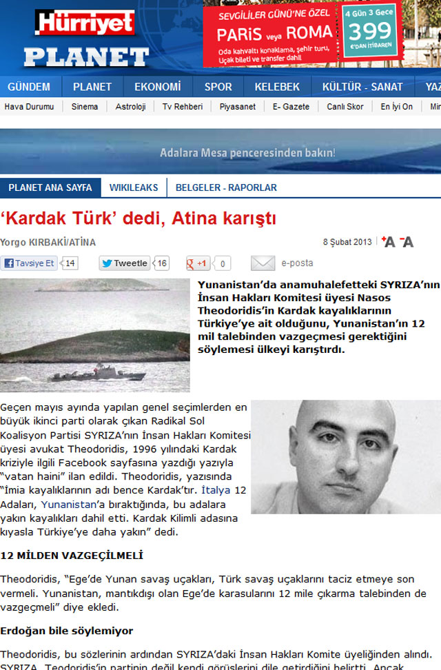 Η εφημερίδα συνεχίζει: «Προδότη της πατρίδας κήρυξαν τον δικηγόρο, μέλος της Επιτροπής Ανθρωπίνων Δικαιωμάτων του ΣΥΡΙΖΑ, για το άρθρο που έγραψε στο Facebook σχετικά με την κρίση των Ιμίων το 1996. Στο άρθρο του αναφέρει: Για εμένα τα Ίμια ονομάζονται Kardak. Όταν η Ιταλία άφησε τα Δωδεκάνησα στην Ελλάδα, περιέλαβε και τις βραχονησίδες που ήταν κοντά σε αυτά. Τα Kardak σε σχέση με την Κάλυμνο είναι πιο κοντά στην Τουρκία».