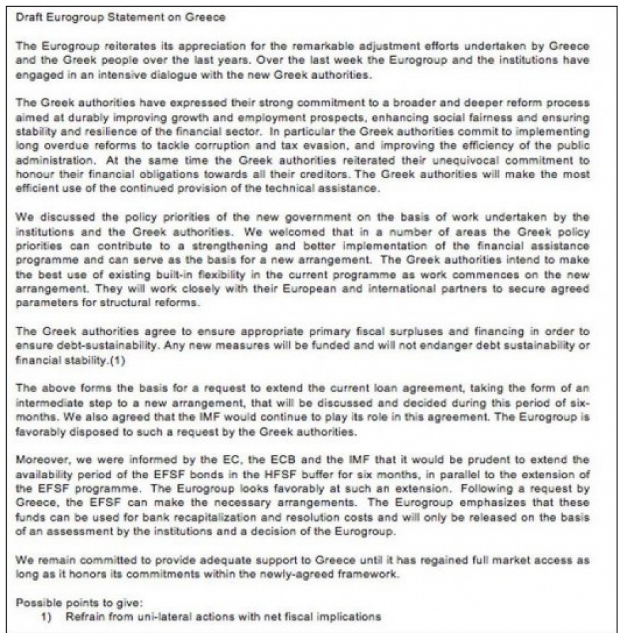 -Θα αναγνωρίσει η Ελλάδα τις δεσμεύσεις της προς τους εταίρους αλλά θα θέσει και όρους οι οποίοι περιλαμβάνονταν στο περίφημο «κείμενο Μοσκοβισί» που ήταν έτοιμος να υπογράψει ο Γιάνης Βαρουφάκης.