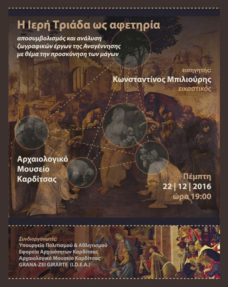 Τον κύκλο των φετινών χριστουγεννιάτικων εκδηλώσεων ανοίγει η ομιλία του συμπολίτη μας εικαστικού κ. Κωνσταντίνου Μπιλιούρη, με τίτλο «Η Ιερή Τριάδα ως αφετηρία: αποσυμβολισμός και ανάλυση ζωγραφικών έργων της Αναγέννησης», η οποία θα πραγματοποιηθεί την Πέμπτη, 22 Δεκεμβρίου 2016, στις 7.00 το απόγευμα, στην αίθουσα εκδηλώσεων του Αρχαιολογικού Μουσείου Καρδίτσας με είσοδο ελεύθερη για το κοινό.