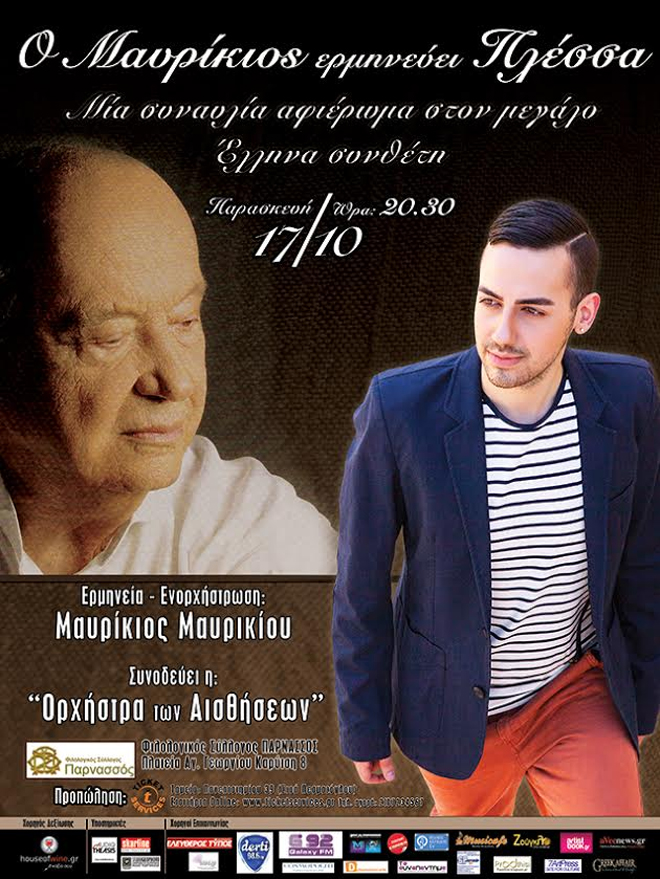 Τον Μαυρίκιο συνοδεύει η δεκαμελής “Ορχήστρα των Αισθήσεων” που δημιούργησε ο ίδιος και η οποία αποτελείται από νέους και ταλαντούχους μουσικούς. Στην επιβλητική αίθουσα συναυλιών του ιστορικού Φιλολογικού Συλλόγου ΠΑΡΝΑΣΣΟΣ την Παρασκευή 17 Οκτωβρίου, ο Μαυρίκιος και η ορχήστρα του θα μας ταξιδέψουν σε μια βραδιά με συναισθήματα και ηχοχρώματα από πιάνο, ακορντεόν, κιθάρα, μπουζούκι, μπαγλαμάς, βιολί, βιολοντσέλο, κοντραμπάσο, φλάουτο, κλαρινέτο, τρομπέτα, σαξόφωνο και κρουστά, με την τιμητική παρουσία του ιδίου του συνθέτη.