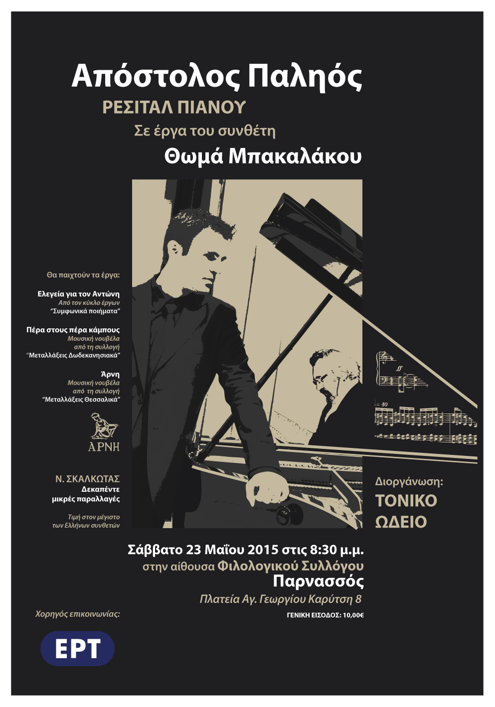 Επιστέγασμα αυτής της συνεργασίας του Θωμά Μπακαλάκου με το σολίστα Απόστολο Παληό και ένας πρώτος σταθμός στους γενικότερους σχεδιασμούς των δύο καλλιτεχνών, αποτελεί το ρεσιτάλ πιάνου της 23ης Μαΐου στον «Φιλολογικό Σύλλογο Παρνασσό». Το άκουσμα στο ρεσιτάλ, των δεκαπέντε παραλλαγών για πιάνο του Νίκου Σκαλκώτα, θα είναι για την απόδοση τιμής, προς τον μέγιστο Έλληνα συνθέτη.