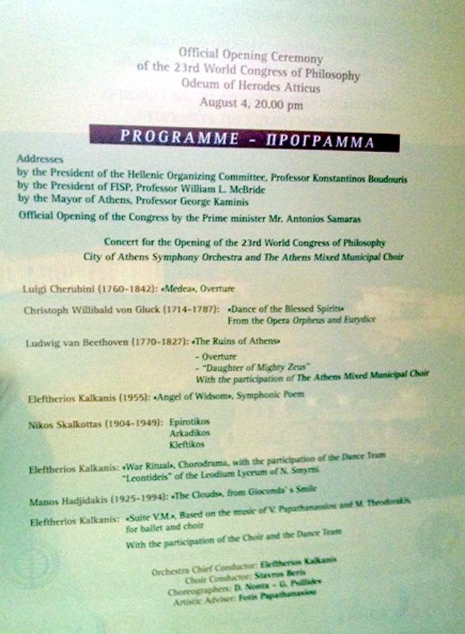 «Σας καλωσορίζουμε στη χώρα όπου δίδαξε ο Πλάτων και Αριστοτέλης, στη χώρα του Ηράκλειτου και του Πρωταγόρα, στη χώρα του Θαλή και του Πυθαγόρα» σημείωσε ο υπουργός Πολιτισμού Πάνος Παναγιωτόπουλος εκφράζοντας τα αισθήματα φιλίας, σεβασμού και ευγνωμοσύνης προς τους συνέδρους για το γεγονός ότι έχουν μελετήσει την ελληνική φιλοσοφία. «Αποτελείτε τους πρεσβευτές της στη σημερινή εποχή» πρόσθεσε. «Ανάμεσά σας υπάρχουν φιλόσοφοι που μπορούν να επηρεάσουν τη σκέψη εκατομμύρια ανθρώπων» ανέφερε ακόμη ο κ. Παναγιωτόπουλος, ο οποίος έγινε στόχος αποδοκιμασιών από μερίδα του κοινού.