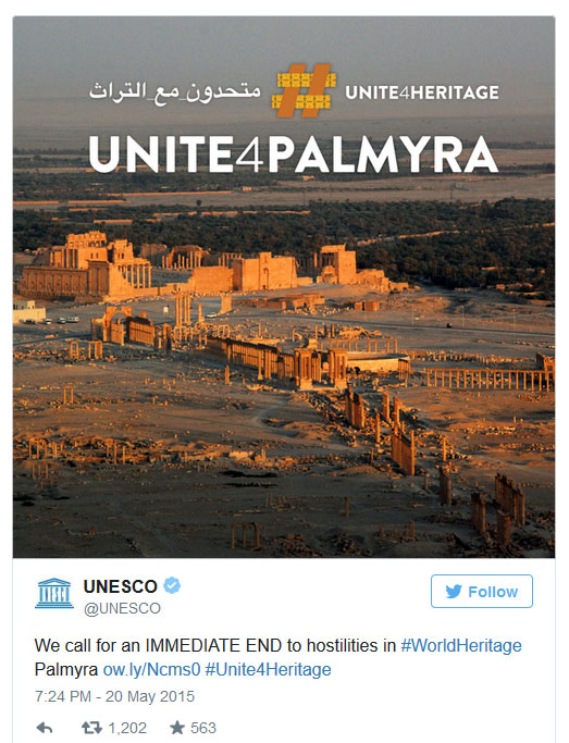Η έκκληση της UNESCO μέσω twitter για τη λήξη των εχθροπραξιών στη Συρία και την προστασία της αρχαίας πόλης της Παλμύρας