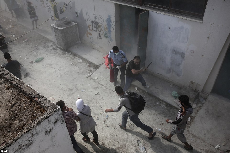 Οι άντρες της ΕΛ.ΑΣ. επιχείρησαν, ακόμη και με πυροσβεστήρες, να απωθήσουν τους μετανάστες, οι οποίοι είχαν κλείσει τον κεντρικό δρόμο του νησιού ενώ κάποιοι από αυτούς πετούσαν πέτρες και μπουκάλια σε διερχόμενα αυτοκίνητα.