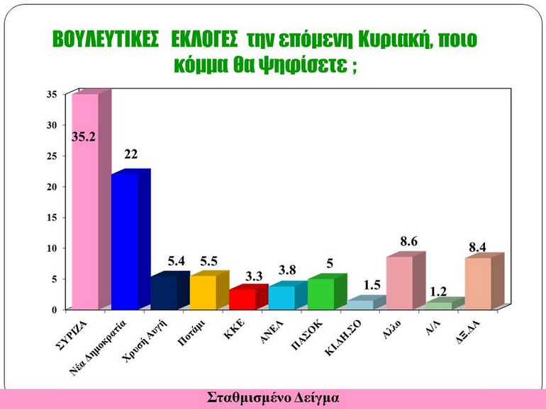 Όσον αφορά στην πρόθεση ψήφου, το ποσοστό του ΣΥΡΙΖΑ είναι 35,2% και έχει διψήφια διαφορά σε σχέση με τη ΝΔ που ενισχύει έστω και οριακά τα ποσοστά της. Τρίτο κόμμα αναδεικνύεται το Ποτάμι με 5,5 με τη Χρυσή Αυγή να ακολουθεί με διαφορά 0,1%. Πιο χαμηλά κινούνται το ΠΑΣΟΚ, οι Ανεξάρτητοι Έλληνες, το ΚΚΕ και το Κίνημα Δημοκρατών Σοσιαλιστών. Σημαντικό ποσοστό, 17,2% περιλαμβάνεται στη δεξαμενή των αναποφάσιστων.