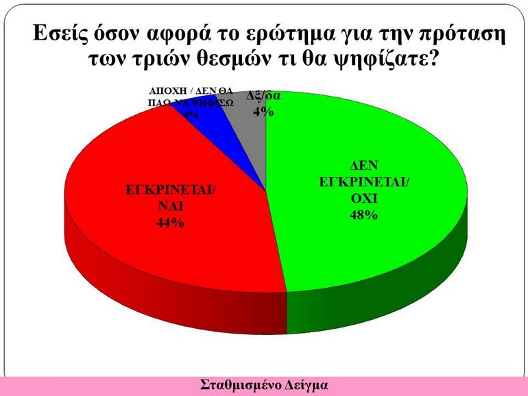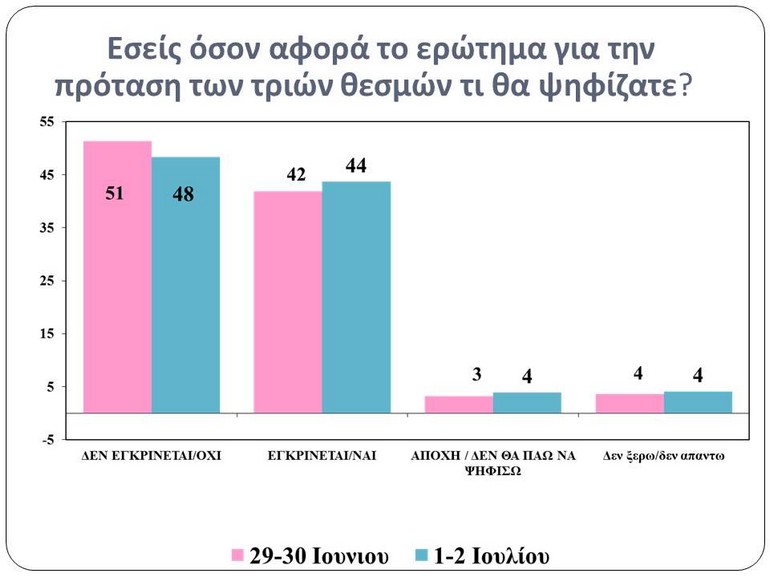 Όσον αφορά στο ερώτημα για την πρόταση των Θεσμών, οι πολίτες την απορρίπτουν κατά 48%, ενώ το 44% ψηφίζει υπέρ του ΝΑΙ στο δημοψήφισμα.