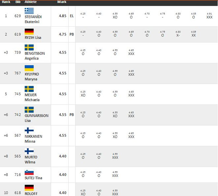 Η Ρίζιχ στα 4.80μ. έριξε τον πήχη και η Στεφανίδη δεν δυσκολεύτηκε να το περάσει με την πρώτη για να σκαρφαλώσει στην πρώτη θέση. Το χρυσό μετάλλιο ήρθε ξεπερνώντας με την πρώτη και τα 4.85 μέτρα.
