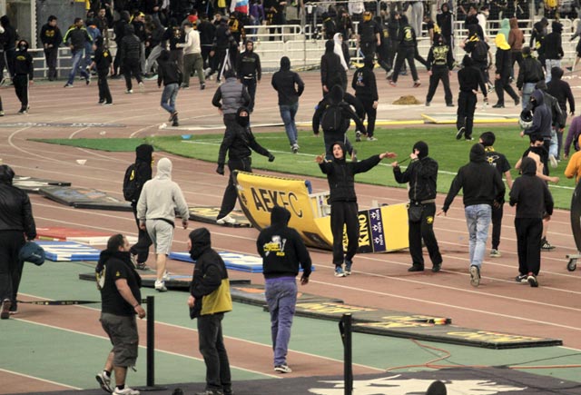 Στο 87ο λεπτό της κρίσιμης αναμέτρησης κι ενώ ο «δικέφαλος» βρέθηκε πίσω στο σκορ με 1-0, μετά το αυτογκόλ του Μπουγαΐδη, οπαδοί των γηπεδούχων εισέβαλαν στον αγωνιστικό χώρο και άρχισαν να σπάνε ό,τι έβρισκαν μπροστά τους.