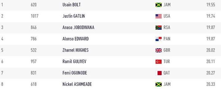 Στην δεύτερη θέση τερμάτισε ο Γκάτλιν με 19.74. Το χάλκινο μετάλλιο πήρε ο Ανάσο Τζομπόντβανα από τη Νότια Αφρική, ο οποίος είχε χρόνο 19,87.