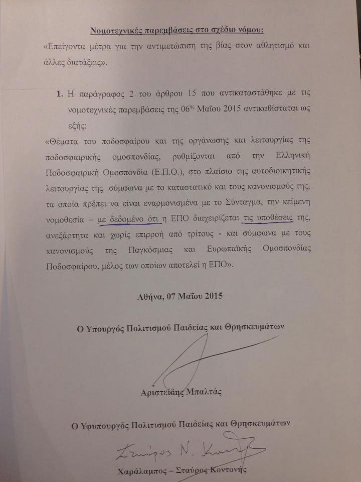 Στο νομοσχέδιο εμπεριέχεται διαφοροποιημένο το άρθρο 15, όπως επιθυμούσαν οι UEFA και FIFA με παρεμβάσεις που έκανε ο υφυπουργός σήμερα μετά από σχετικές προτάσεις που έγιναν κατά την διαδικασία.