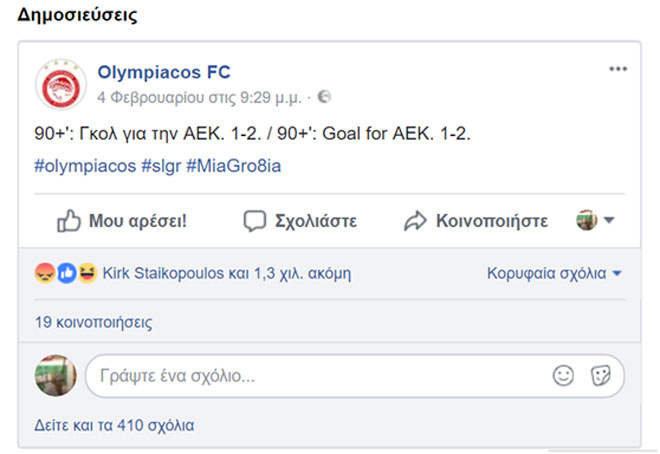 Η ανάρτηση της Π.Α.Ε. Ολυμπιακός στην επίσημη σελίδα της στο Facebook,