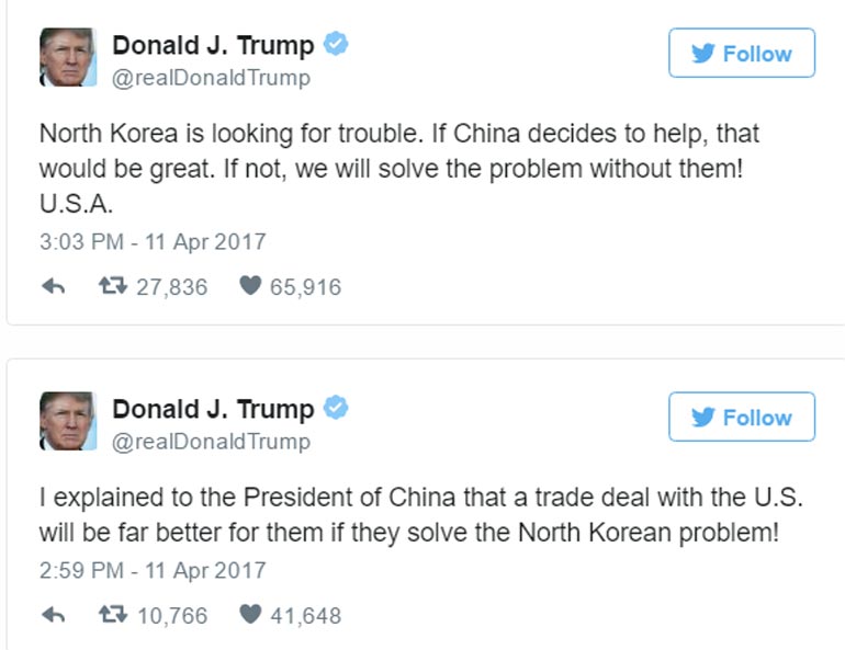 Το Πεντάγωνο έστειλε το μεγαλύτερο του αεροπλανοφόρο, το Carl Vinson των 97.000 τόνων στην περιοχή, μαζί με τη συνοδεία του, με τον Πρόεδρο να δηλώνει ότι «η Βόρεια Κορέα γυρεύει για μπελάδες, αν η Κίνα βοηθήσει, έχει καλώς, αν όχι θα λύσουμε το πρόβλημα μόνοι μας»…