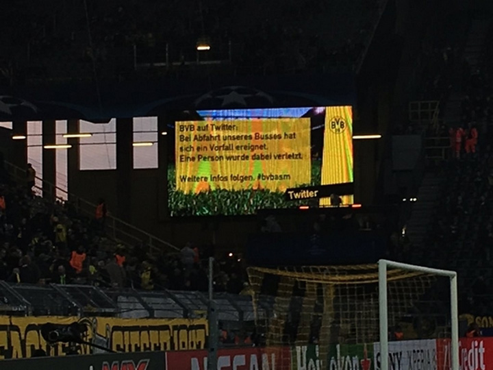 Το παιχνίδι της Ντόρτμουντ με την Μονακό για τους «8» του Champions League αναβλήθηκε και θα διεξαχθεί την Μ. Τετάρτη (19:45), καθώς σημειώθηκε έκρηξη κοντά στο πούλμαν των Βεστφαλών. Οι πρώτες πληροφορίες αναφέρουν ότι η έκρηξη σημειώθηκε περίπου 10 χιλιόμετρα μακριά από το γήπεδο, ενώ αποτέλεσμα ήταν να σπάσουν τζάμια από το ωστικό κύμα.