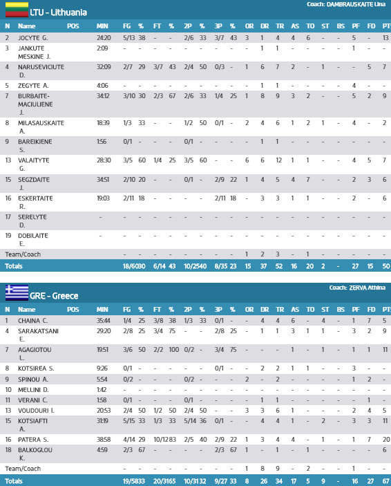 ΛΙΘΟΥΑΝΙΑ: Γιόκιτε (13 (3), Μεσκίνε, Ναρουσεβιτσιούτε 7 (7 ριμπ.), Ζέγκιτε, Μπουρμπάιτε 9 (1 τρίπ., 9 ριμπ.), Μιλασαουσκάιτε 2, Μπαρεϊκιένε, Βαλάϊτίτε 7 (3 τρίπ., 12 ριμπ.), Σεγκζντάιτε 6, Εσκερκάιτε 6.