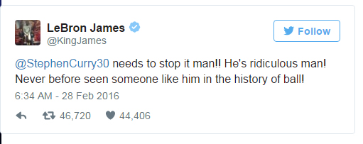 «Ο Στεφ Κάρι πρέπει να το σταματήσει! Είναι γελοίο! Δεν έχω ξαναδεί κάποιον σαν κι αυτόν στην ιστορία του μπάσκετ» έγραψε ο Λεμπρόν Τζέιμς.