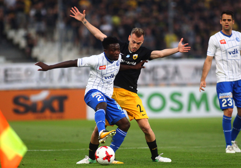 Πάντως, η ΑΕΚ είχε δοκάρι στο 35΄, όταν ο Χριστοδουλόπουλος βρήκε τον Μπακάκη που ερχόταν από πίσω, αυτός μπήκε στην περιοχή και σούταρε. Δύο λεπτά αργότερα οι Βέλγοι άνοιξαν το σκορ, από το «δώρο» του Τσιγκρίνσκι που έκανε λάθος γύρισμα προς τον Ανέστη. Ο Σιλά έκλεψε την μπάλα, τη γύρισε στον Αντριάσεβιτς κι εκείνος έκανε το 0-1.