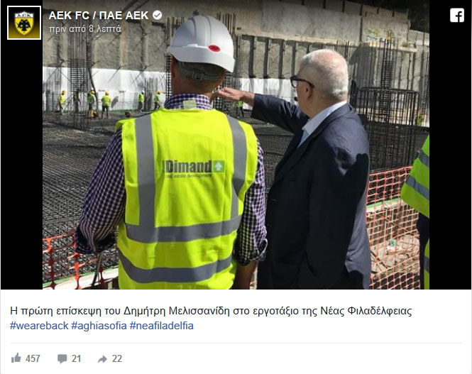Μάλιστα, στην ιστορική αυτή στιγμή για την «Ένωση» έδωσε το παρών και ο μεγαλομέτοχος του συλλόγου, Δημήτρης Μελισσανίδης, ο οποίος βρέθηκε για πρώτη φορά στον χώρο όπου θα ανεγερθεί το «σπίτι» της ΑΕΚ, προκειμένου να τσεκάρει από κοντά την πορεία των έργων.