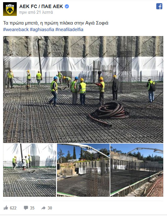 Με πυρετώδεις ρυθμούς συνεχίζονται οι εργασίες στη Νέα Φιλαδέλφεια για την ανέγερση της «Αγιας- Σοφιάς», με την πρώτη πλάκα να πέφτει την Πέμπτη στο ιστορικό οικόπεδο, όπως ενημέρωσε κι επίσημα την Πέμπτη η ΠΑΕ ΑΕΚ.
