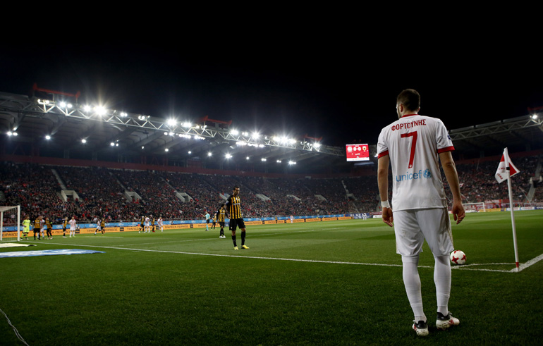 11′ Δυνατές μονομαχίες στα πρώτα λεπτά του ντέρμπι. Ο Ολυμπιακός προσπαθεί να πάρει την κατοχή και η ΑΕΚ αναζητά τις αντεπιθέσεις.