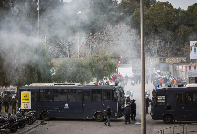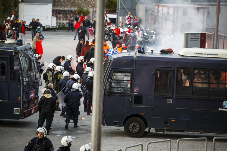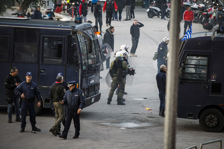 Οι δράστες προσπάθησαν να διασπάσουν το μπλόκο που είχαν δημιουργήσει οι κλούβες της αστυνομίας στον χώρο της άφιξης των αποστολών των δύο ομάδων. Όπως αναφέρουν οι πληροφορίες υπήρξε ρίψη βόμβας μολότοφ.