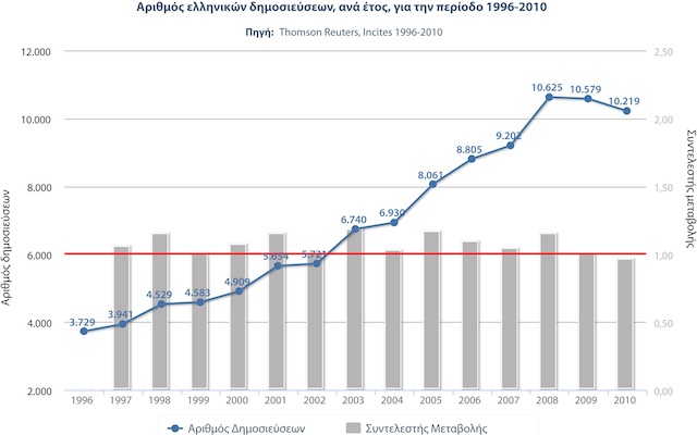 Ο αριθμός των ελληνικών επιστημονικών δημοσιεύσεων αυξάνεται συνεχώς έως το 2008, με ρυθμούς σημαντικά μεγαλύτερους από τις χώρες μέλη της Ευρωπαϊκής Ένωσης και του ΟΟΣΑ. Το 2009 η συνεχής αυτή ανοδική πορεία ανακόπτεται, η Ελλάδα ακολουθεί τη μέση επίδοση των χωρών του ΟΟΣΑ και της ΕΕ και καταγράφει σχεδόν μηδενικό συντελεστή μεταβολής. Το 2010 παρατηρείται μείωση του αριθμού των δημοσιεύσεων τόσο στον ΟΟΣΑ όσο και στην ΕΕ. Στην Ελλάδα δυστυχώς, η υποχώρηση είναι μεγαλύτερη.