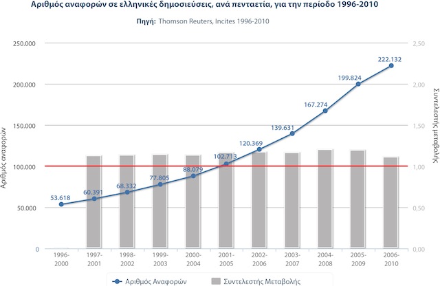 Όσον αφορά τον αριθμό των αναφορών, η Ελλάδα παρουσιάζει μεγαλύτερους ρυθμούς αύξησης σε σχέση με τις χώρες της ΕΕ και του ΟΟΣΑ, σε όλη τη διάρκεια της περιόδου 1996-2010. Την πενταετία 2006-2010 οι ελληνικές δημοσιεύσεις έλαβαν 222.132 αναφορές, αριθμός σχεδόν τετραπλάσιος από την περίοδο 1996-2010.