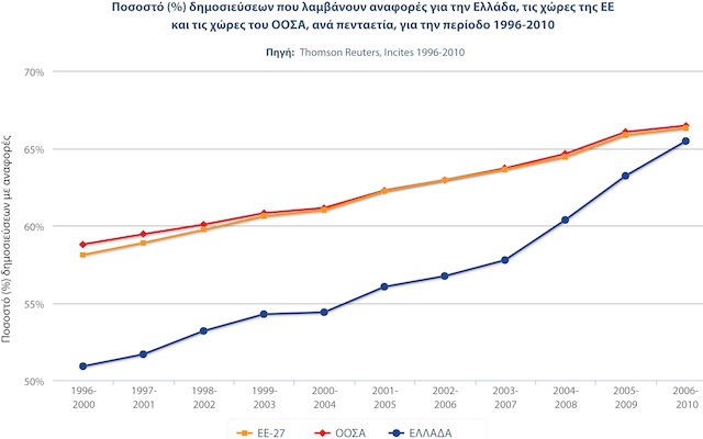 Ποσοστό (%) δημοσιεύσεων που λαμβάνουν αναφορές για την Ελλάδα, τις χώρες της ΕΕ και του ΟΟΣΑ, ανά πενταετία, για την περίοδο 1996-2010. Όπως φαίνεται στο Διάγραμμα, η Ελλάδα συγκλίνει με τον ευρωπαϊκό και διεθνή μέσο όρο, στο ποσοστό των δημοσιεύσεων που λαμβάνουν αναφορές.