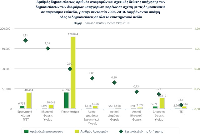 Στις δημοσιεύσεις με την υψηλότερη απήχηση παγκοσμίως (top 1%) κατατάχθηκαν την πενταετία 2006-2010, 400 δημοσιεύσεις από τα Πανεπιστήμια, 89 δημοσιεύσεις από τα Ερευνητικά Κέντρα της ΓΓΕΤ, 42 από τους Δημόσιους Φορείς Υγείας, 23 από τους Ιδιωτικούς Φορείς Υγείας, 11 από τους Λοιπούς Δημόσιους Ερευνητικούς Φορείς, 10 από τα ΤΕΙ, 6 από τους Λοιπούς Δημόσιους Φορείς και 5 από τους Λοιπούς Ιδιωτικούς Φορείς.