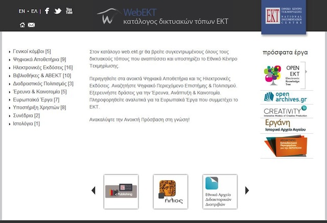 Κατάλογο των δικτυακών τόπων που αναπτύσσει και υποστηρίζει εγκαινίασε πρόσφατα το Εθνικό Κέντρο Τεκμηρίωσης (ΕΚΤ), στη διεύθυνση http://web.ekt.gr. Στον κατάλογο «WebEKT» βρίσκονται συγκεντρωμένες όλες οι δράσεις, τα έργα και οι δραστηριότητες που υλοποιεί ή συμμετέχει ο φορέας, και είναι προσβάσιμα μέσω των επιμέρους δικτυακών τόπων.