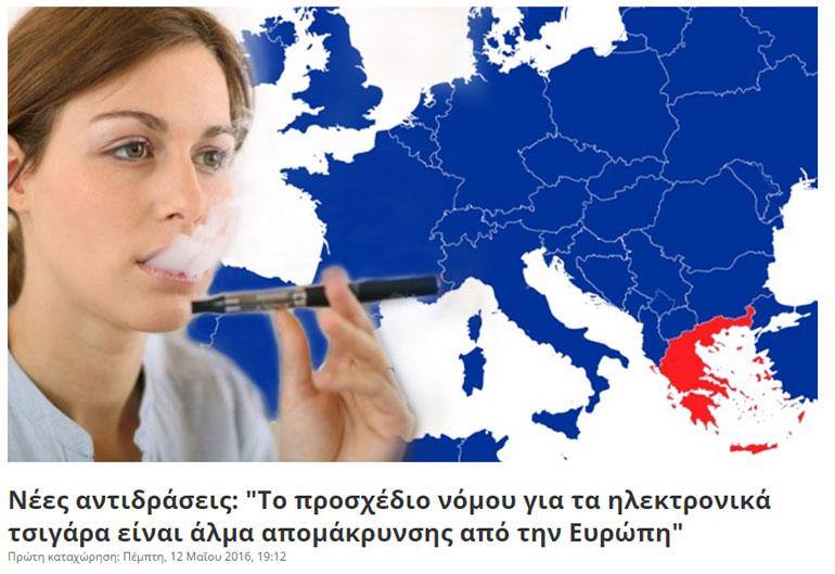 Η πρόσφατα δημοσιευμένη ελληνική νομοθεσία (http://www.opengov.gr/yyka/?p=1458) εξομοιώνει το ηλεκτρονικό τσιγάρο με το κάπνισμα, θέτει επιστημονικά ατεκμηρίωτους περιορισμούς στη χρήση και αποτελεί τροχοπέδη στην σωστή ενημέρωση των καπνιστών και στην δυνατότητά τους να ελαττώσουν σημαντικά τον κίνδυνο για την υγεία τους χρησιμοποιώντας ένα λιγότερο βλαπτικό εναλλακτικό προϊόν. Η νομοθεσία είναι στην ουσία τιμωρητική για τους καπνιστές, τους περιθωριοποιεί και τους αντιμετωπίζει ως υπεύθυνους για την εξάρτησή τους στην βλαπτική αυτή συνήθεια, ενώ παράλληλα υποστηρίζει και προστατεύει τα συμβατικά τσιγάρα.