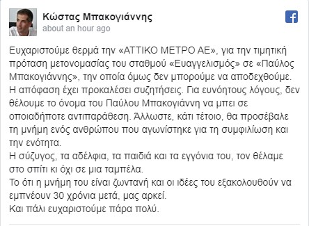 Την άρνηση της να αποδεχθεί μετονομασία του σταθμού Ευαγγελισμός δημοσιοποίησε η οικογένεια του Παύλου Μπακογιάννη, ύστερα από τις συζητήσεις που πυροδότησε τo σχετικό σχέδιο της Αττικό Μετρό.
