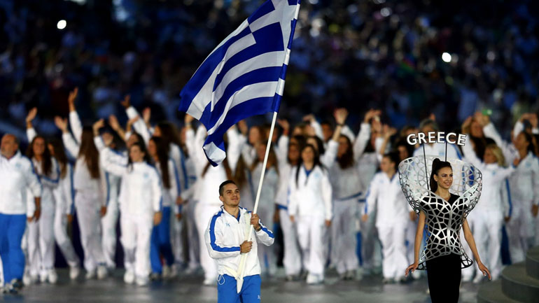 (Η είσοδος της ελληνικής αποστολής με σημαιοφόρο τον Πετρούνια)