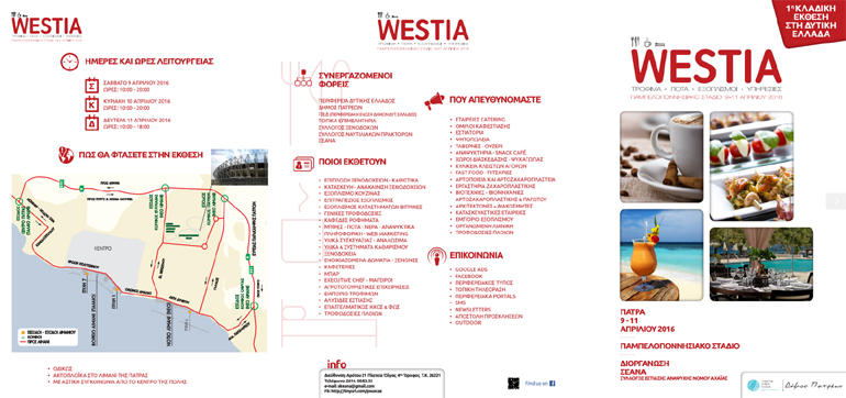 Η πρώτη κλαδική έκθεση για επιχειρήσεις εστίασης, αναψυχής και ξενοδοχειακών υπηρεσιών διοργανώνεται στη Δυτική Ελλάδα και συγκεκριμένα στο Παμπελοποννησιακό Στάδιο Πατρών, από 9 έως και 11 Απριλίου 2016 με την ονομασία «WESTIA».