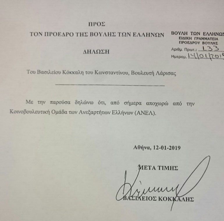 Από το Σάββατο είχε ετοιμάσει την έξοδό του από τους Ανεξάρτητους Έλληνες ο υφυπουργός Αγροτικής Ανάπτυξης Βασίλης Κόκκαλης, ο οποίος βρίσκεται σε ταξίδι στην Ασία.
