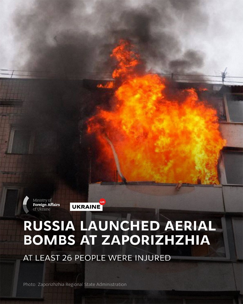 Η ουκρανική αστυνομία, σύμφωνα με το BBC, ανακοίνωσε ότι σε διάστημα μισής ώρας την Ζαπορίζια έπληξαν τρεις κατευθυνόμενες αεροπορικές βόμβες. Δύο από τις βόμβες έπληξαν πολυκατοικίες, καταστρέφοντας 130 διαμερίσματα. Η τρίτη βόμβα έπληξε μια υποδομή όπου προκλήθηκαν ζημιές στις εγκαταστάσεις παραγωγής, Η τέταρτη βόμβα εξερράγη δίπλα σε γυμνάσιο. Οι μαθητές δεν τραυματίσθηκαν, αλλά τραυματίσθηκε μια γυναίκα.