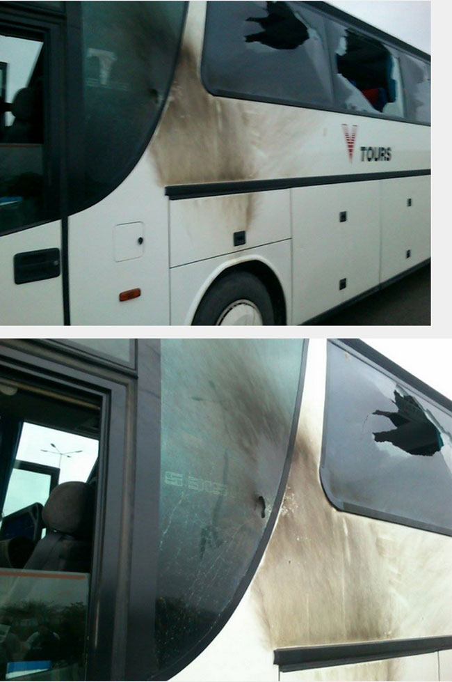 Παράλληλα, σύμφωνα με το thessports.gr, λεωφορείο που δεν συμμετείχε στο κομβόι δέχθηκε επίθεση με πέτρες και μολότοφ στο ύψος του Αϊ-Γιάννη.