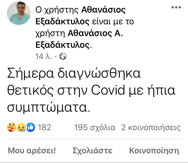 «Σήμερα διαγνώστηκα θετικός στην Covid με ήπια συμπτώματα» έγραψε χαρακτηριστικά ο πρόεδρος του ΠΙΣ και μέλος της επιτροπής των λοιμωξιολόγων στο facebook.(Posted by ΑθανάσιοςΕξαδάκτυλος on Sunday, January 24, 2021)